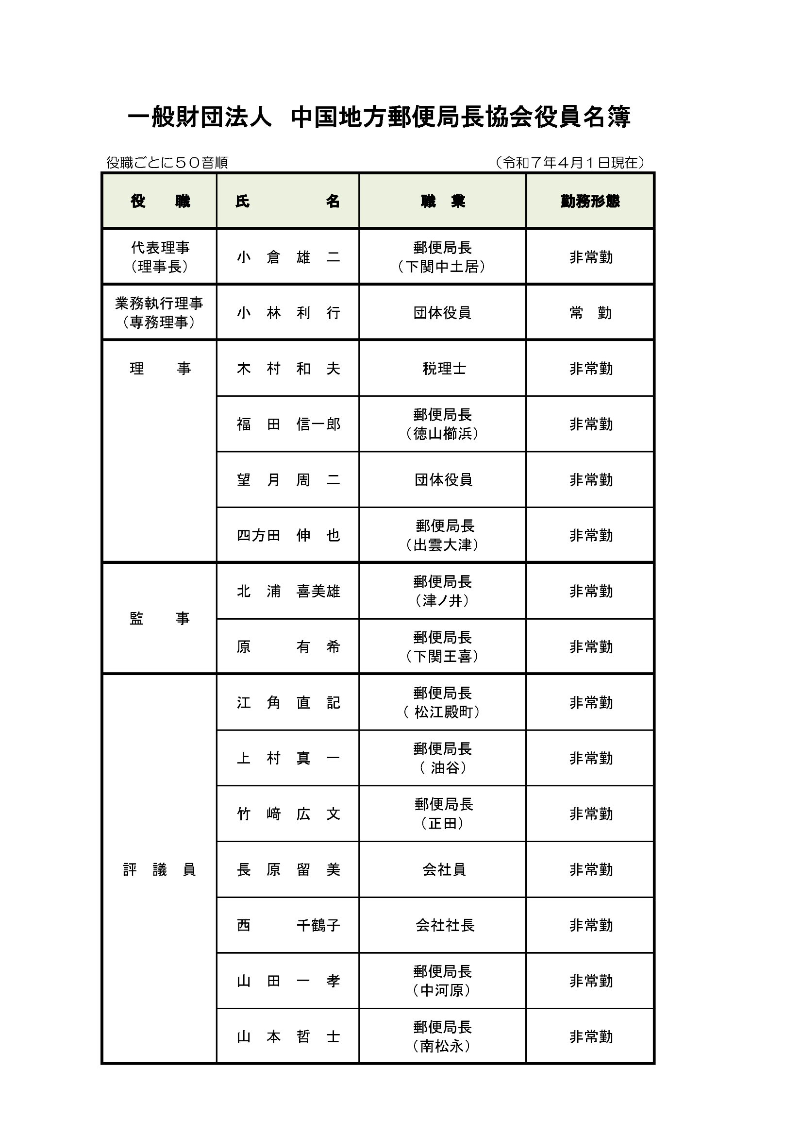 この法人は、中国地方における郵便局の業務の円滑な運営及び会員相互の扶助に関する事業を行い、郵政事業の発展に寄与するとともに地域貢献活動を推進することを目的とする。